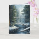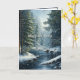 Beautiful Christmas card with an image of snow covered rocks, tall pine trees, snowflakes and a lovely flowing river.