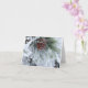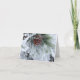 Blank note card with beautiful winter scene of a pine tree and pine cone covered in snow. Matching postage