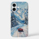 An energetic impressionistic painting captures a thrilling winter race through a snow-covered mountain landscape. A bright red vintage race car speeds along a winding road, kicking up snow, while towering evergreen trees and rugged peaks frame the background. The sky is painted with broad, expressive strokes of icy blue and white, giving a sense of movement and cold atmosphere. The texture of the paint is thick and gestural, emphasizing the rush and energy of the scene. The combination of bold, impressionistic brushwork and the contrast between the warm red of the car and the cool blue snow creates a striking composition full of excitement and motion.