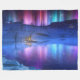 The northern lights glow above a snowy winter landscape. Shafts of pink, purple, blue, and green light up the snow-covered fields and reflect from a frozen lake. By the water stands a cottage with warm light streaming from its windows and smoke coming from the chimney - a cosy refuge from the sparkling cold.