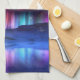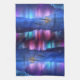 The northern lights glow above a snowy winter landscape. Shafts of pink, purple, blue, and green light up the snow-covered fields and reflect from a frozen lake. By the water stands a cottage with warm light streaming from its windows and smoke coming from the chimney - a cosy refuge from the sparkling cold.