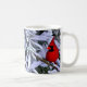 A beautiful Red Cardinal resting among snowy winter evergreens.