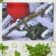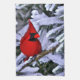 A beautiful Red Cardinal resting among snowy winter evergreens.