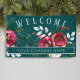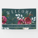 Dark hunter blue green welcome banner featuring red burgundy and white peony roses bouquets with seasonal foliage, red berries and fir branches, and your company name. ++++++++ Suitable for holiday / Christmas parties, open house, cocktails.