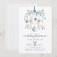 Invite loved ones to celebrate your little one with this charming winter reindeer baby shower invitation. The design features two sweet reindeer beneath a hanging mobile of blue ornaments, greenery, and a satin bow for a festive holiday touch. Soft blue tones and striped backing make this invite ideal for a blue baby shower invitation, gender neutral baby shower invite, or a December holiday baby sprinkle.