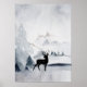Poster with a watercolor image featuring a black silhouette reindeer standing among some pine trees. Grey black and white neutral colour scheme.
