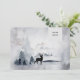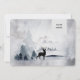 Wedding invitation with a watercolor image featuring a black silhouette reindeer standing among some pine trees. Grey black and white neutral colour scheme.