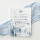 Elegant winter wedding invitation features a watercolor background depicting a snowy mountain landscape dotted with pine trees in misty shades of blue and grey. Personalise with your wedding details in chic soft off-black lettering, topped with your monogram or duogram joined by a decorative script ampersand. A beautiful choice for elegant winter weddings in mountain or forest settings.