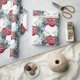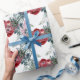 A Christmas holiday wrapping paper featuring a watercolor-painted trellis of red roses in early winter with pine and spruce tree stems and berries formed into a lush holiday trellis.