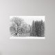 A black and white photograph captures a serene winter landscape. A large, bare tree covered in snow stands prominently on the left, its branches reaching out. To the right, a dense forest of snow-laden pine trees creates a textured backdrop. The ground is covered in a blanket of snow, with subtle hints of grass peeking through.