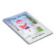 Winter scene with a snowman wearing a pink hat and scarf and carrying a candy cane. A lime green gift bag is beside the snowman with a spiral lollipop and bear inside. "Happy snow days" text. There is a place for your name and date to personalise.