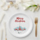 Paper plates with a digital image of a painted illustration of a red church and steeple. A bright Christmas star shining overhead. Families out in front arriving for a church service. Winter snow covers the ground and rests on cute bushy pine trees. Merry Chirstmas written in a red trendy font,