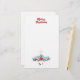Stationery with a digital image of a painted illustration of a red church and steeple. A bright Christmas star shining overhead. Families out in front arriving for a church service. Winter snow covers the ground and rests on cute bushy pine trees. Merry Chirstmas written in a red trendy font.