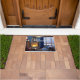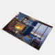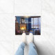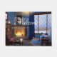 A cosy reading corner on a snowy winter day, with a ginger cat sitting gazing at the blazing fire. Around the hearth are cushy armchairs, with glowing candles and stacks of books and a steaming mug to complete the comfort. Outside a frost-covered willow and beech hedge are obscured by the falling snow.