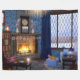 A cosy reading corner on a snowy winter day, with a ginger cat sitting gazing at the blazing fire. Around the hearth are cushy armchairs, with glowing candles and stacks of books and a steaming mug to complete the comfort. Outside a frost-covered willow and beech hedge are obscured by the falling snow.