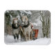 Old fashioned red winter sleigh color image, being pulled through the snow in a forest of snow covered trees by two white draft horses.