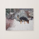 Winter snow scene with cute black and tan dog jigsaw puzzle