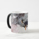 This original Christmas image is a painting of a very cute little black and tan mixed breed dog, he’s sniffing and scratching at the thick layer of freshly fallen snow that he’s just discovered for the first time in the garden. This little dog is named Eddie, he’s a german shepherd cross breed dog and he’s enjoy the cold weather in his winter garden. In the background of this festive picture you can see a little grey garden gnome quietly sitting and reading his book at the side of the small snow covered frozen pond. There’s also lots of snow covered garden shrubs and an old wooden shed in Eddie’s garden, all these add interest to this lovely little festive Christmas snow scene mug.