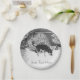 This original snow scene image on this cute dog paper plate is from a painting of a little black and tan mixed breed dog, he’s sniffing and scratching at the thick layer of freshly fallen snow that he’s just discovered for the first time in the garden. This little dog is named Eddie, he’s a german shepherd cross breed dog and he’s enjoy the cold weather in his winter garden. In the background of this scenic snow picture you can see a little grey garden gnome quietly sitting and reading his book at the side of the small snow covered frozen pond. There’s also lots of snow covered garden shrubs and an old wooden shed in Eddie’s garden, all these bits and bobs add interest to this lovely little winter snow scene on this customisable christmas paper plate. You can personlise this christmas plate with your own text. The original painting of Eddie in the snow is tilted "First Snow" and is an acrylic painting. This image has been digitally enhanced to give it a greyscale effect.