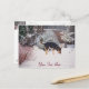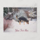 This original Christmas image is a painting of a very cute little black and tan mixed breed dog, he’s sniffing and scratching at the thick layer of freshly fallen snow that he’s just discovered for the first time in the garden. This little dog is named Eddie, he’s a german shepherd cross breed dog and he’s enjoy the cold weather in his winter garden. In the background of this festive picture you can see a little grey garden gnome quietly sitting and reading his book at the side of the small snow covered frozen pond. There’s also lots of snow covered garden shrubs and an old wooden shed in Eddie’s garden, all these add interest to this lovely little festive Christmas snow scene postcard. This is a customisable postcard, you can personalise it with your own text. This acrylic painting is titled "First Snow."