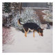 This original snow scene image on this cute dog quality value poster is from a painting of a little black and tan mixed breed dog, he’s sniffing and scratching at the thick layer of freshly fallen snow that he’s just discovered for the first time in the garden. This little dog is named Eddie, he’s a german shepherd cross breed dog and he’s enjoy the cold weather in his winter garden. In the background of this scenic snow picture you can see a little grey garden gnome quietly sitting and reading his book at the side of the small snow covered frozen pond. There’s also lots of  snow covered  garden shrubs and an old wooden shed in Eddie’s garden,  all these bits and bobs add interest to this lovely little winter snow scene on this quality art poster. The original painting of Edie in the snow is tilted "First Snow" and is an acrylic painting.