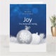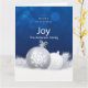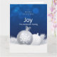 Celebrate your winter Christmas in style with this festive blue and white design featuring silver and white tree baubles with a snowflake pattern resting in fresh snow. The words "Merry Christmas" and Joy appear above the decorations and a blue bokeh is seen in the background. Personalise the inside greeting to meet your holiday greeting or message to friends and family.