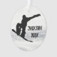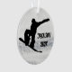 Acrylic snowboarder's Christmas ornament with name and date template. Black silhouette of a freestyle snowboarder over a white snow photography background. Reverse is just blank snow. Gender neutral, black and white theme, could be for a boy or girl.