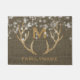 Country chic, burlap gold glitter deer antlers personalised doormat perfect for winter or a country Christmas holiday- Brown, shabby rustic burlap faux texture background. Personalised family name at the bottom in gold colour, elegant letters. Jumbo, matching monogram initial with a shadow effect is centred above a pair of festive, gold glitter buck deer antlers. Rustic, white snowflakes are scattered over the top half and have a worn, stamped effect. Rustic welcome for guests in front of a cosy log cabin. Country chic, monogrammed winter housewarming gift, family Christmas gift, or unique wedding shower gift for the newlyweds. Note: All images are printed. Not actual glitter or burlap. Elegant decor for the winter holidays or for deer hunters or animal lovers. Spruce up your front porch with a gold glitter holiday or winter woodland forest animal theme!