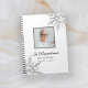 Funeral Guest Book. This classy custom wintery memorial tribute notebook features intricate grey snowflakes adorning the corners with a white background. Personalise it with birth and death date, name and picture.