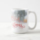Custom tall coffee mug featuring cute winter snowman holding a shovel in the snow with "Merry Christmas" in red glitter script typography.