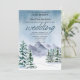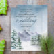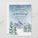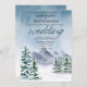 Winter wedding design featuring watercolor background depicting a snowy mountain landscape and pine trees in shades of blue and grey. The text can easily be personalised for a unique one of a kind design for your special day.A chic choice for elegant winter weddings in mountain or forest