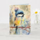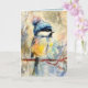 This expressive songbird illustration features a small bird perched on winter branches, bundled in a textured blue knit hat. Vibrant gold and soft blue tones blend with painterly brushstrokes to create a cozy yet lively winter scene. A charming greeting card for bird lovers, winter greetings, and artful correspondence.