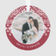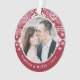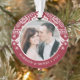 Festive Christmas photo ornament features a favourite photo on each side, encircled by a holiday sweater pattern. Personalise with your custom caption; shown with "married and merry" on one side and your names on the reverse. Perfect for displaying wedding photos on your first married Christmas!
