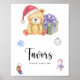 "There's a Beary Sweet baby on the way". Celebrate with this teddy bear themed baby shower party! Watercolor cute teddy bear with christmas gift, in santa hat. On the reverse side of the card are holiday christmas pattern (candy cane, christmas tree ball toy, christmas socks). Matching items available.