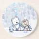 Sandstone coaster featuring Westie and Yorkie Terriers in a snowy forest, by children's book Illustrator, Kim Niles.