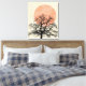 A silhouette of a tree with bare branches in winter with a reddish sun on a light beige background.