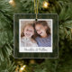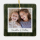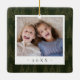 A beautiful double sided Christmas photo ornament displaying a favourite photo on each side, on a dark hunter green watercolor background dotted with pine trees. Personalise with a custom caption on the front in handwritten lettering, and add the year to the back.