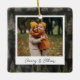 A beautiful double sided Christmas photo ornament displaying a favourite photo on each side, on a black watercolor background dotted with pine trees. Personalise with a custom caption on the front in handwritten lettering, and add the year to the back.