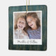 A beautiful double sided Christmas photo ornament displaying a favourite photo on each side, on a dark teal watercolor background dotted with pine trees. Personalise with a custom caption on the front in handwritten lettering, and add the year to the back.