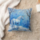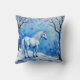 A dreamlike scene captures a unicorn in a moment of quiet contemplation amidst a gentle snowfall. The primary colours are cool blues, icy whites, and whispers of silver. The unicorn, with its flowing mane and tail, is depicted with slightly stronger pigment to stand out, while the falling snow is created with tiny, delicate white spatter marks and lighter washes. The ground is a blend of snowy white and faint blue shadows, with bare tree branches appearing as soft, blurred lines in the background, adding to the tranquil and ethereal mood. The overall effect is delicate and almost crystalline, perfect for a calming interior space.