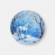 A dreamlike scene captures a unicorn in a moment of quiet contemplation amidst a gentle snowfall. The primary colours are cool blues, icy whites, and whispers of silver. The unicorn, with its flowing mane and tail, is depicted with slightly stronger pigment to stand out, while the falling snow is created with tiny, delicate white spatter marks and lighter washes. The ground is a blend of snowy white and faint blue shadows, with bare tree branches appearing as soft, blurred lines in the background, adding to the tranquil and ethereal mood. The overall effect is delicate and almost crystalline, perfect for a calming interior space.