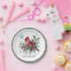 Birthday paper plates featuring a watercolor Northern Cardinal. Winter vibes, snowflakes. Customisable.
