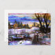 Boy, Girl & Dog on winter path to house with Christmas lights, surrounded by trees, snowman in front yard, deer by decorated Christmas tree, geese in snow, fields & mountains and a sunset sky.