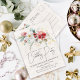 Red and white winter watercolor flowers are nestled in soft sage green leaves and foliage. Gold snowflakes add a festive touch. An elegant, simple and modern script gives it a open and airy vibe. There is also a winter floral boquet on the back, your return address and space for you to personalise the information about your event.