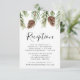 Rustic wedding reception card featuring a top border of watercolor pinecones and pine boughs. "Reception" is displayed in a modern calligraphy script with your wedding reception details shown below. Designed to coordinate with our Winter Watercolor Pinecone wedding collection.