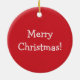 This penguin is dressed in a blue and white winter hat and scarf. Background is red with white snowflakes. Back is red with white "Merry Christmas!" text that may be personalised.