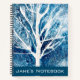 Winter theme blue and white watercolor painting of a white birch tree with snow background. Arty original artwork with a Christmas theme. Blue and white Christmas.