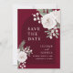 Gorgeous white floral and foliage, set over a rich burgundy background, in a minimalist design... with your event details in modern script and classic font, set inside a deeper burgundy arch. Simple. Elegant. Perfect for a winter wedding.