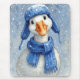 A whimsical watercolor goose wearing a blue hat and scarf, surrounded by softly falling snow, creates an enchanting winter scene.