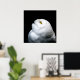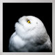 Portrait photograph of a beautiful white Snowy Owl with yellow eyes on black background.